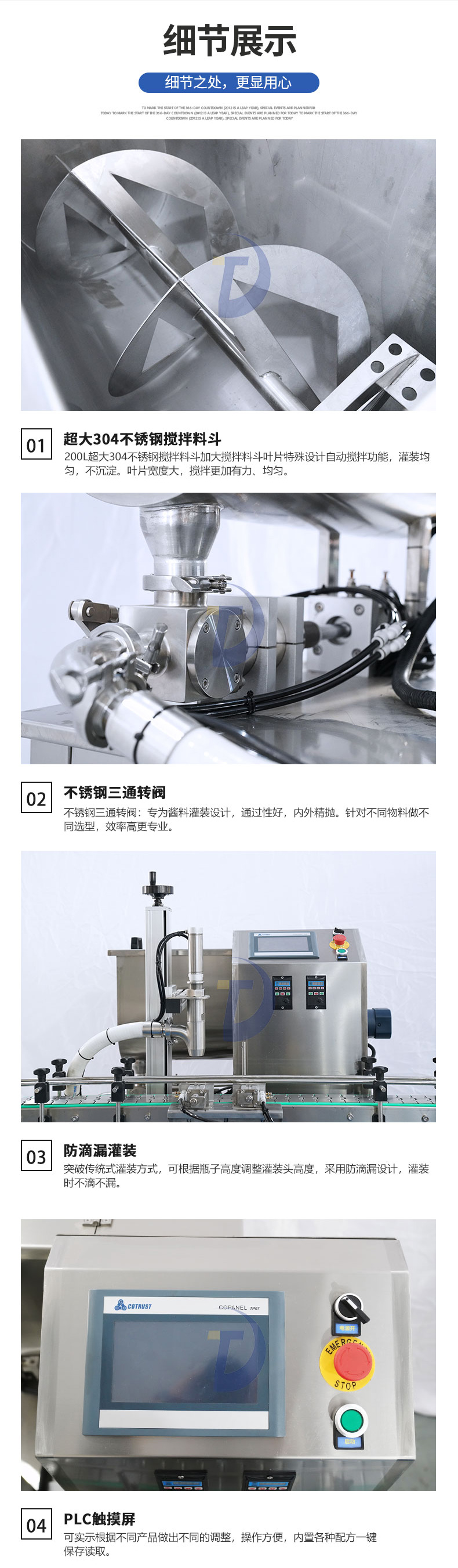 小型醬料灌裝生產線 包括半自動將料灌裝機 半自動真空旋蓋機以及半自動貼標機 適用于初期辦廠研發設計。灌裝機用于垃圾愛哦將、拌面醬、豆瓣醬、大塊肉醬等物料的定量灌裝,變頻攪拌讓物料均勻,200L的大料斗讓物料充足。南自動真空旋蓋機單人便可以操作,支持多種瓶型抽真空旋蓋,適用于塑料、金屬材質的圓蓋。