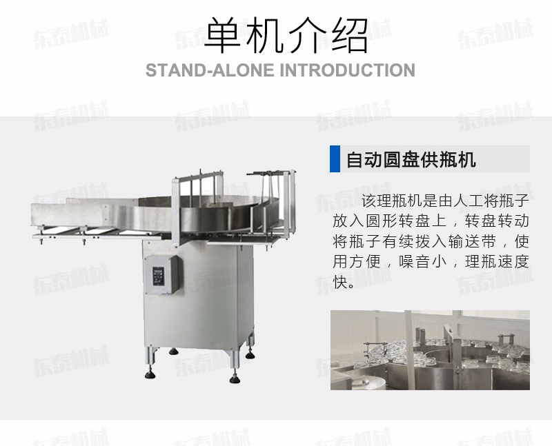 該理瓶機是由人工將瓶子放入圓形轉盤上,轉盤轉動將瓶子有續撥入輸送帶,進入灌裝機進行灌裝。使用方便,噪音小,理瓶速度快,操作簡單是不可缺少的一個環節。