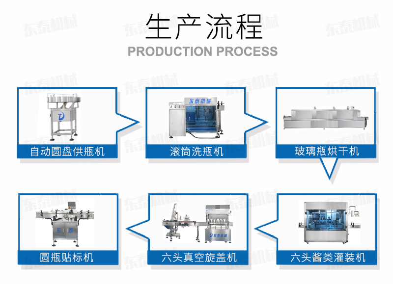 自動供瓶機+全自動滾筒洗瓶機+自動六米烘干機+自動收瓶機+全自動六頭灌裝機自動灌裝+全自動提蓋機自動理蓋、提蓋、掛蓋+六頭真空旋蓋機同時六個頭真空旋蓋+套標機+收縮機+圓瓶貼標機+整理平臺;