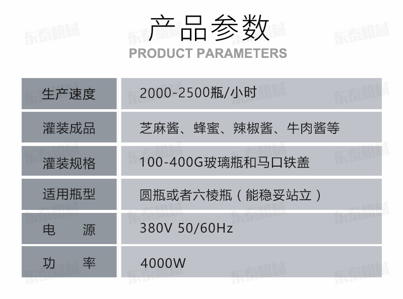B、灌裝機采用橫推料的方式,縮短了下料斗到灌裝頭的距離,提高了灌裝速度,更重要的是解決了含油量大的物料在灌裝過程中出現的有的瓶油多,有些瓶醬多的灌裝難.,大大提高了灌裝精度。