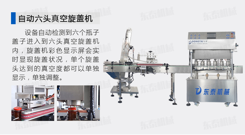 該直線式真空旋蓋機是東泰機械結合用戶使用的情況,摒棄了傳統轉盤式真空旋蓋機的弊端,研制開發的設備,設備自動檢測到六個瓶子蓋子進入到六頭真空旋蓋機內,旋蓋機彩色顯示屏會實時顯現旋蓋狀況,整機多點檢測,當進口無瓶無蓋、出口堵塞、定位不準、瓶身傾倒均自動停機。單個旋蓋頭達到的真空度都可以單獨顯示,單獨調整!