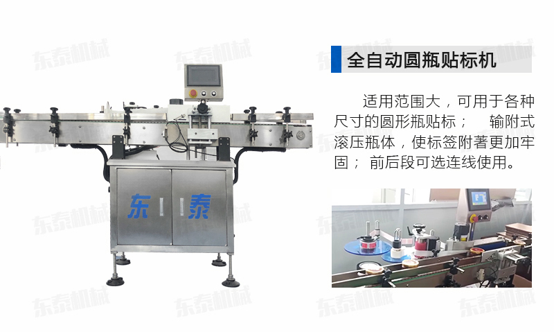 全機采用的技術:微電腦-PLC-電子光纖傳感器控制系統,使整機運行穩定、高速; 操作系統采用操作界面控制,操作簡便、實用、效率高,并有產量記數功能; 技術的速度快且穩定; 適用范圍大,可用于各種尺寸的圓形瓶貼標; 輸附式滾壓瓶體,使標簽附著更加牢固; 前后段可選連線使用。