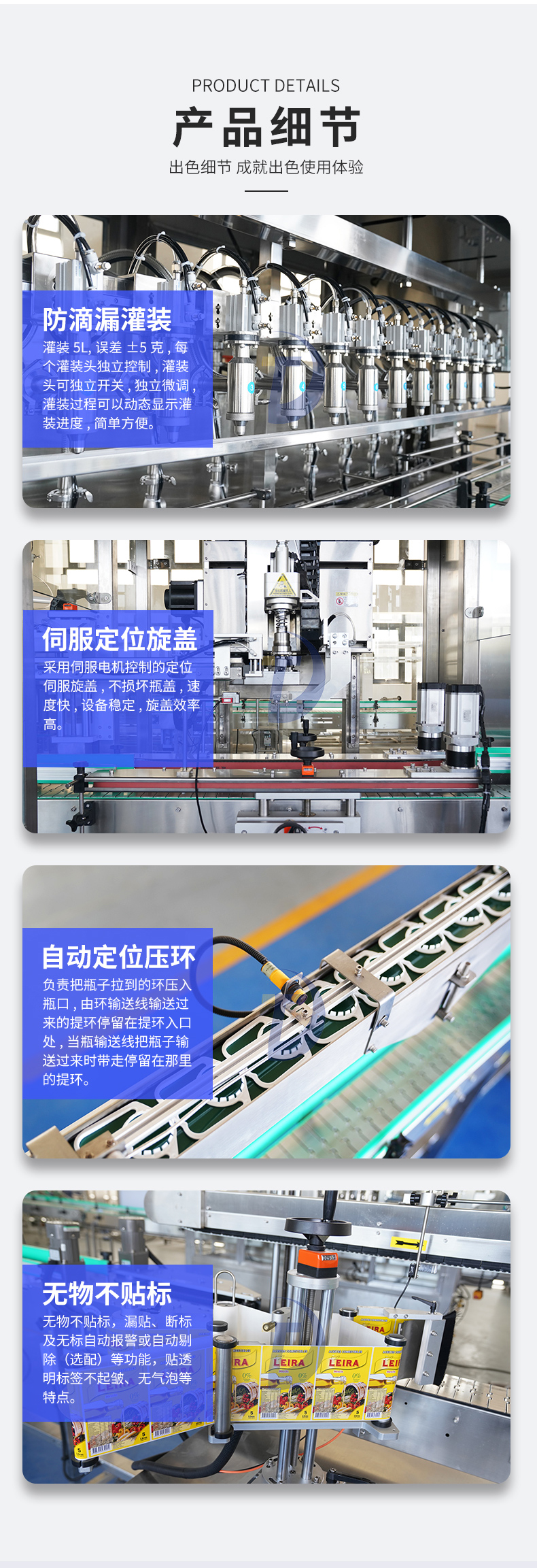 當油桶移動到灌裝頭下方時,灌裝頭會自動啟動,開始進行自動灌裝。在這個過程中,灌裝頭會感應油桶的存在,并根據設定好的參數自動進行灌裝。當油桶已經達到預定容量后,灌裝頭會自動關閉,停止灌裝。