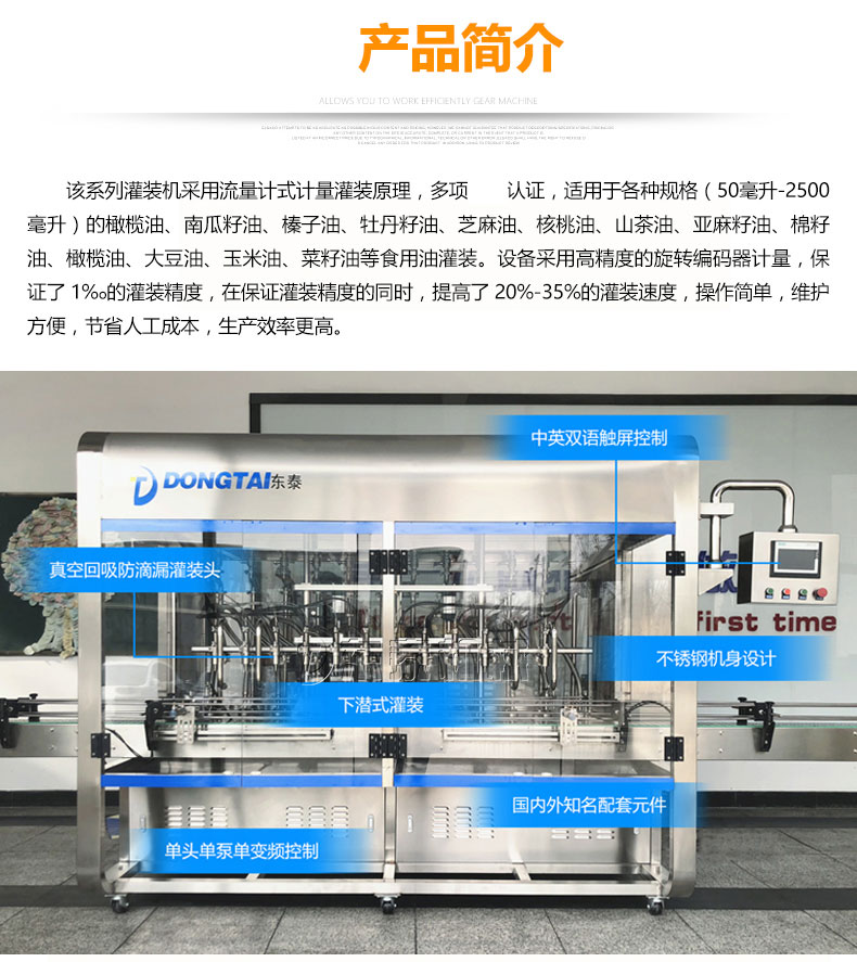 該食用油灌裝機采用流量計式計量灌裝原理,多項認證,適用于各種規格(1-5升)的南瓜籽油、榛子油、牡丹籽油、芝麻油、核桃油、山茶油、亞麻籽油、棉籽油、橄欖油、大豆油、玉米油、菜籽油等食用油灌裝。設備采用高精的旋轉編碼器計量,保證了1%o的灌裝精度,在保證灌裝精度的同時,提高了20%-35%的灌裝速度,操作簡單,維護方便,節省人工成本,生產效率更高。