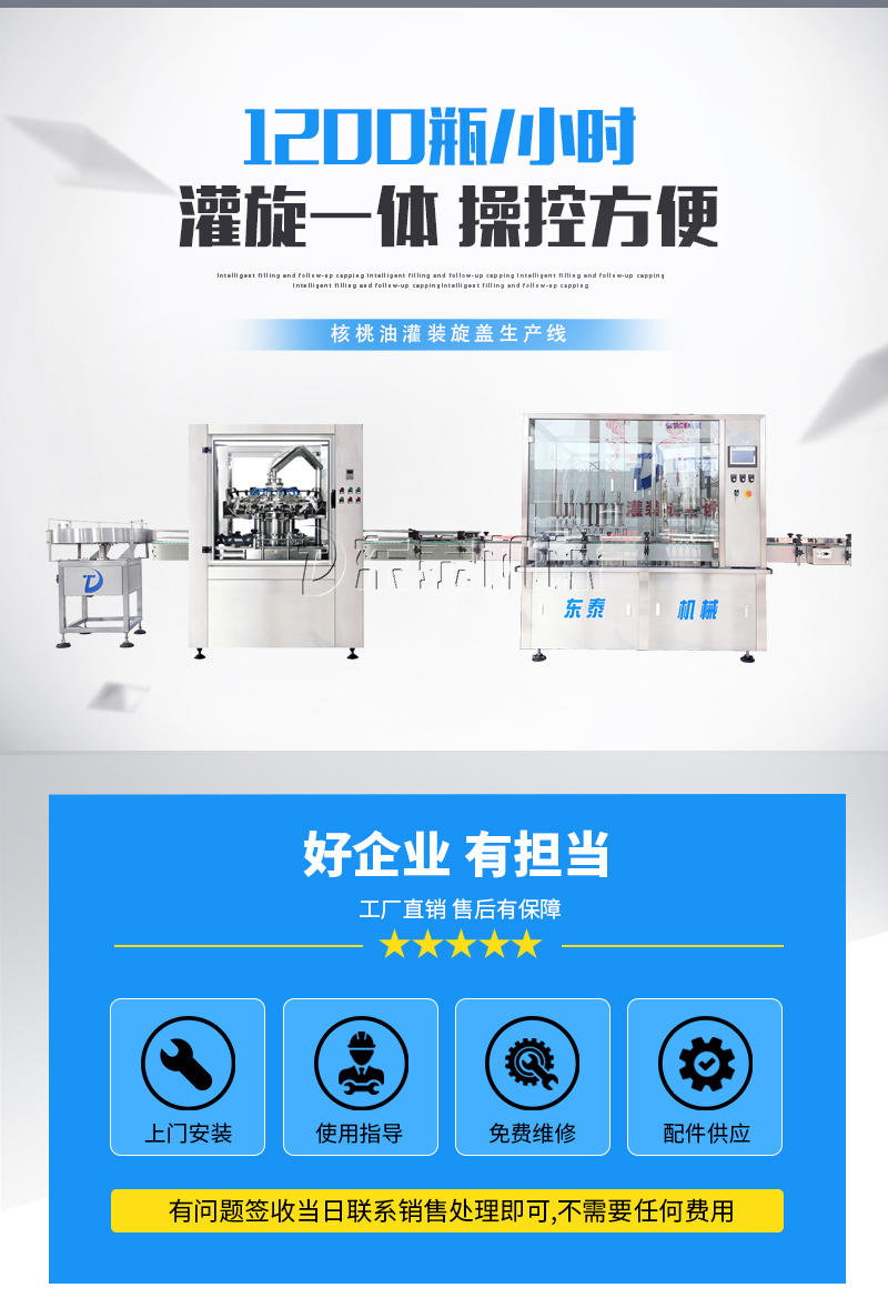 1、本橄欖油灌裝旋蓋機生產線采用機械手旋蓋,配備自動打滑裝置,防止瓶蓋損傷。